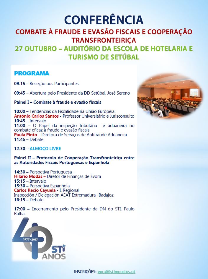 No âmbito das Comemorações do 40º Aniversário do STI vai realizar-se a Conferência “COMBATE À FRAUDE E EVASÃO FISCAIS E COOPERAÇÃO TRANSFRONTEIRIÇA”, no próximo dia 27 de outubro, no Auditório da Escola de Hotelaria e Turismo de Setúbal, conforme programa em anexo.