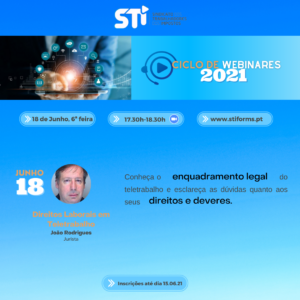 Dentro do Ciclo de Webinars 2021 o Sindicato dos Trabalhadores dos Impostos vai realizar, através da plataforma ZOOM, um Webinar sobre Direitos Laborais em Teletrabalho, sexta-feira dia 18 de Junho, das 17h30 às 18h30.