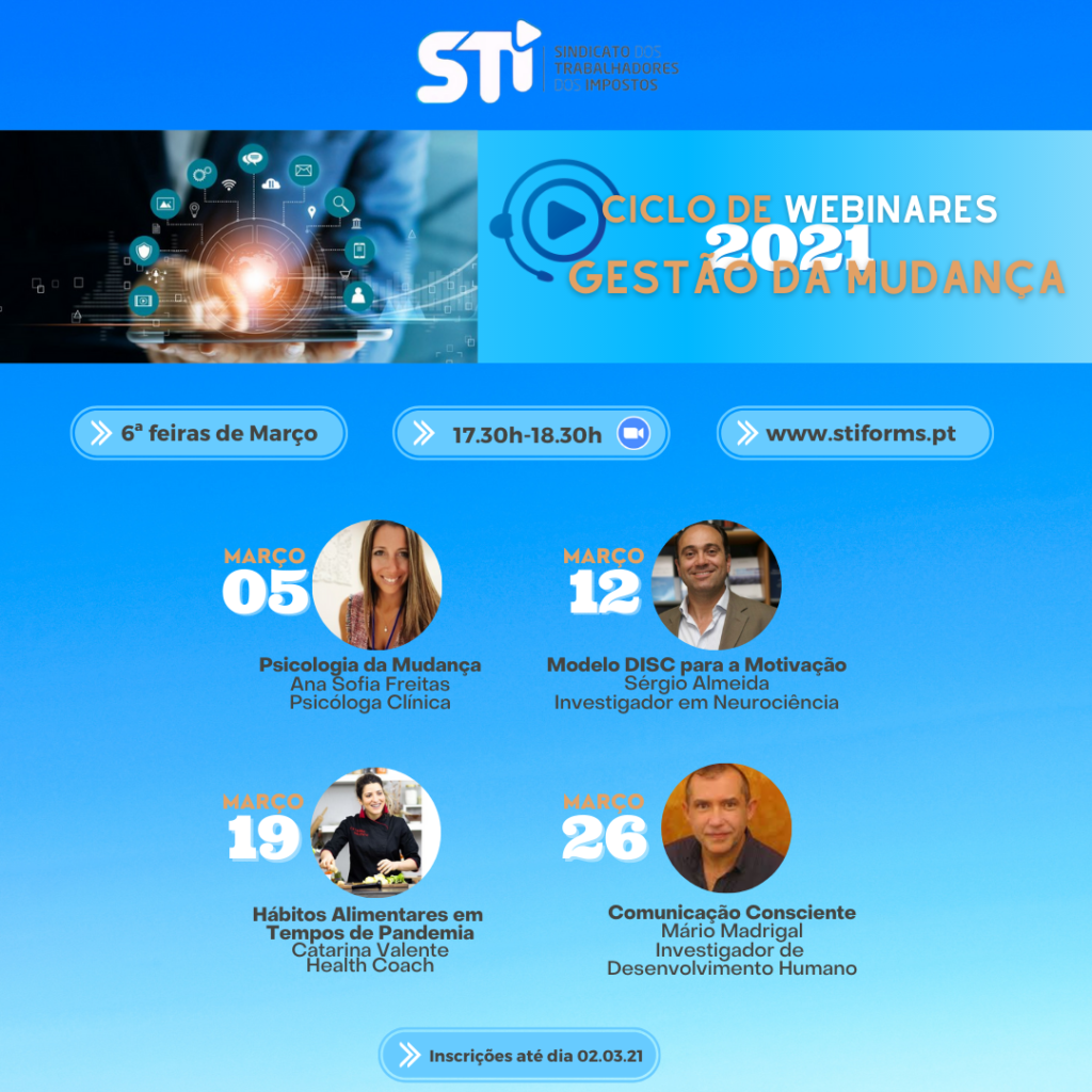 O Sindicato dos Trabalhadores dos Impostos (STI) vai realizar, através da plataforma ZOOM, o CICLO DE WEBINARS 2021 – GESTÃO DA MUDANÇA, durante o mês de março, às sextas-feiras, das 17:30h às 18:30h.