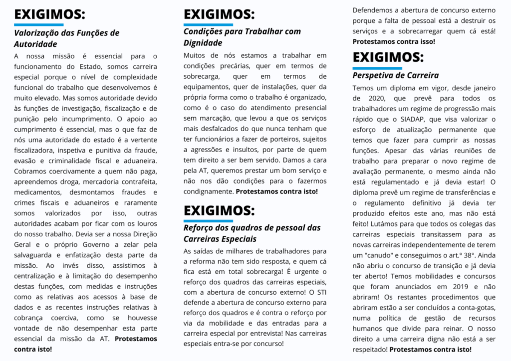 Não faltam motivos para os trabalhadores da Autoridade Tributária e Aduaneira aderirem a este protesto, nos dias 1 a 5 de dezembro, e mostrarem ao atual governo e ao país que exigimos respeito pelas funções que desempenhamos e que não aceitamos passivamente a destruição da AT.
