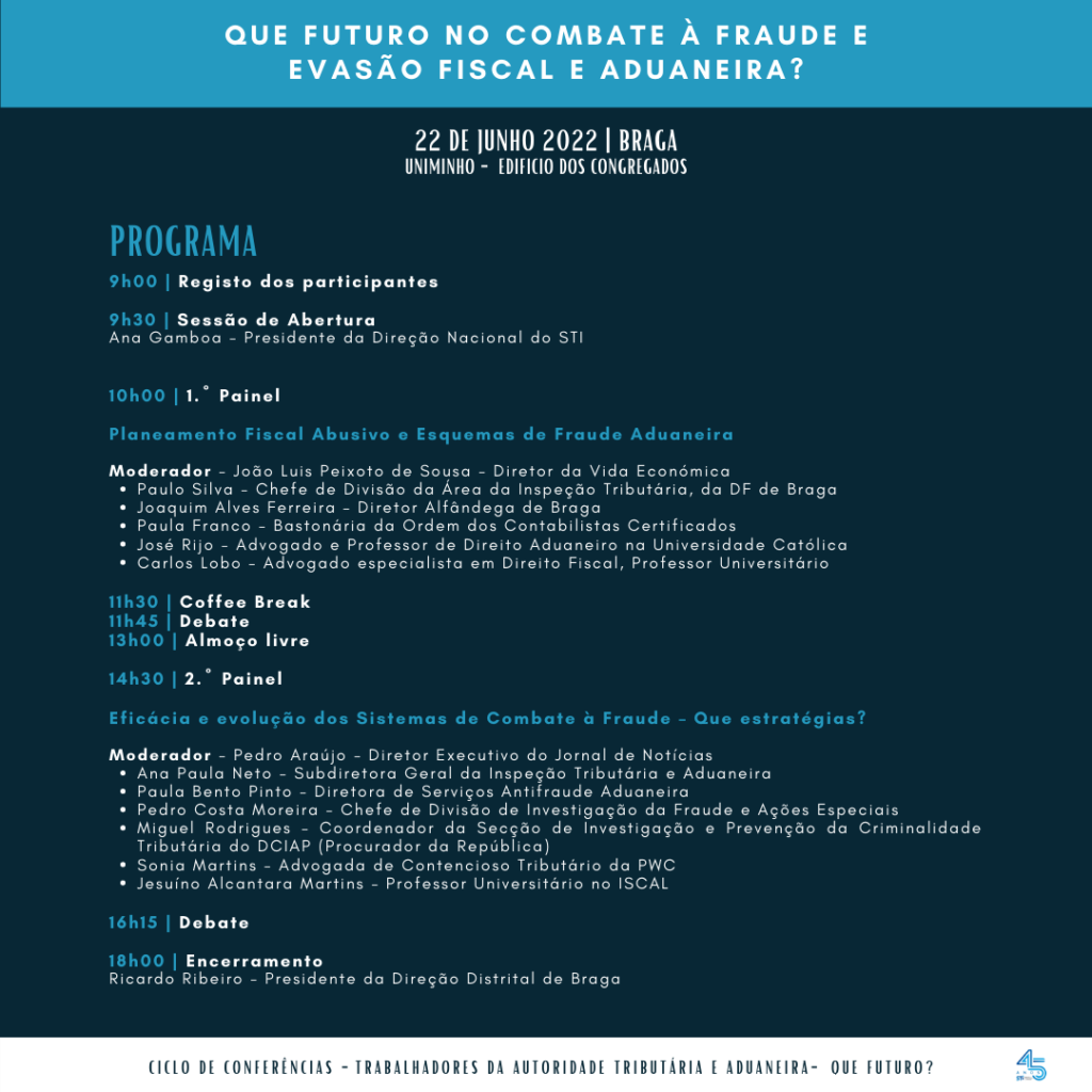 - “QUE FUTURO NO COMBATE À FRAUDE E EVASÃO FISCAL E ADUANEIRA?” – 22/JUNHO – UNIMINHO – EDIFICIO DOS CONGREGADOS – BRAGA