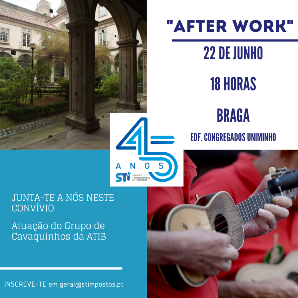 Este convívio contará com a atuação do Grupo de Cavaquinhos da ATIB – Associação de Trabalhadores dos Impostos de Braga e integra as comemorações do 45.º Aniversário do STI, realizando-se na sequência da conferência subordinada ao tema “QUE FUTURO NO COMBATE À FRAUDE E EVASÃO FISCAL E ADUANEIRA?”, a realizar no mesmo dia e local, estando aberto, não apenas aos participantes na conferência, mas a todos os colegas que, podendo, se queiram juntar, depois do trabalho.