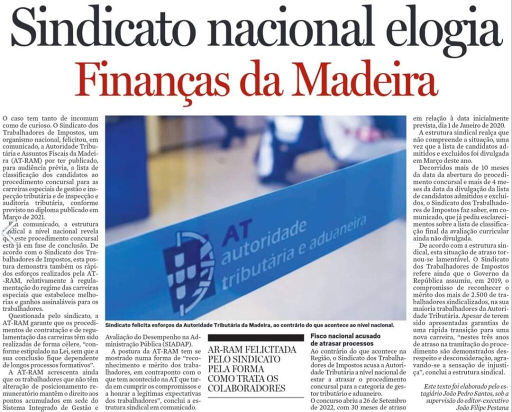 14 Ago Diário Notícias Madeira | Sindicato nacional elogia Finanças da Madeira Submetido às 10:57h em Boletim de Notícias, Imprensa por STI Partilhar Imprimir 25 Gostaram