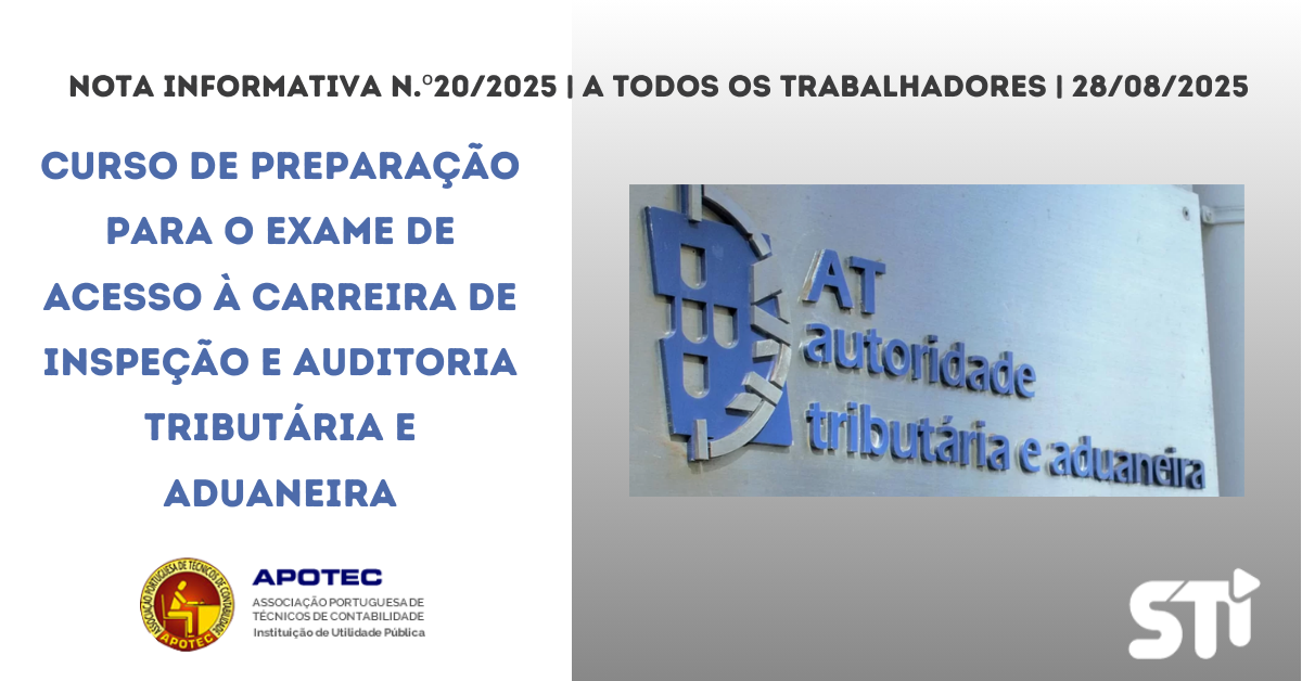 – Para os Associados do STI que já constam nos nossos registos, o processo de inscrição é o habitual, compra direta no site https://www.apotec.pt/pt/formacao/curso-de-preparacao-para-o-exame-de-acesso-a-carreira-de-inspecao-e-auditoria-tributaria-e-aduaneira/